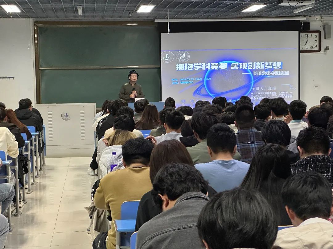讲座中,史进老师对专业学科竞赛、科技创新项目等进行了系统讲解,分享了重要的参赛经验和技巧。史老师指出,学科竞赛作为实践教学的重要环节,不仅能够检验学生对专业知识的掌握程度与应用能力,更能有效激发学生的创新思维、团队协作精神以及解决实际问题的能力,是培养适应新时代需求的高素质创新型人才的重要途径。在互动交流环节中,面对同学们提出的各种疑问,史老师耐心剖析,逐一解惑。