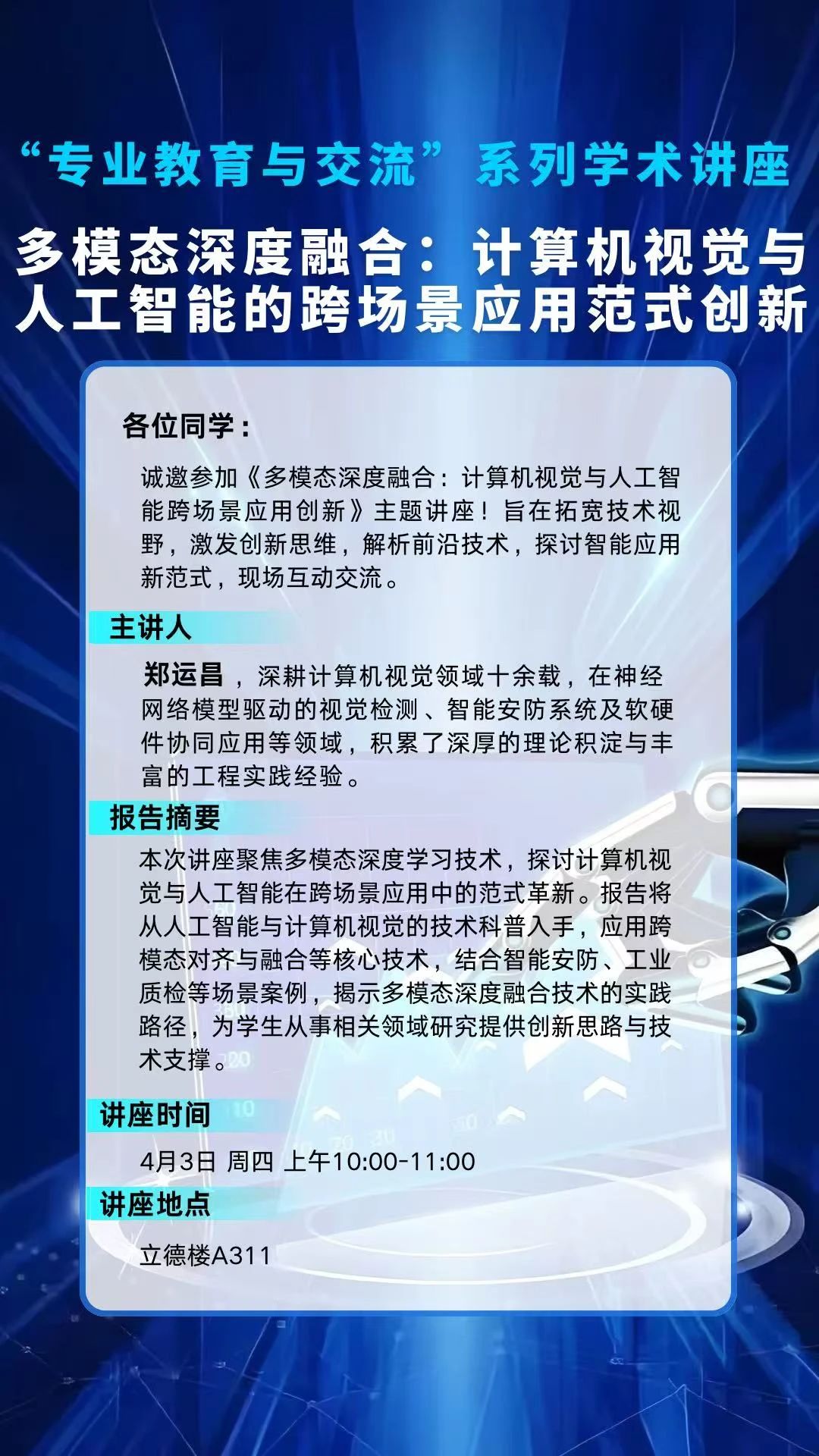 hth华体育官网“专业教育与交流”系列学术讲座第四讲预告: 《多模态深度融合:计算机视觉与人工智能的跨场景应用范式创新》