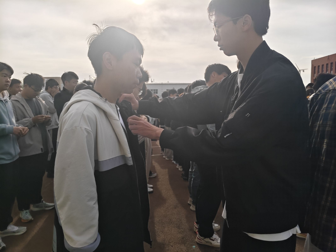 受到五四表彰的老团员依次为新团员佩戴团徽,每一枚团徽都承载着共青团的光荣与责任,佩戴过程庄重而有序。当团徽别在胸前,新团员们的眼神中多了一份坚定与自豪,他们正式成为了共青团这个光荣集体的一员。